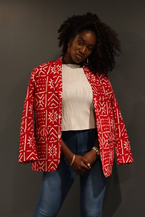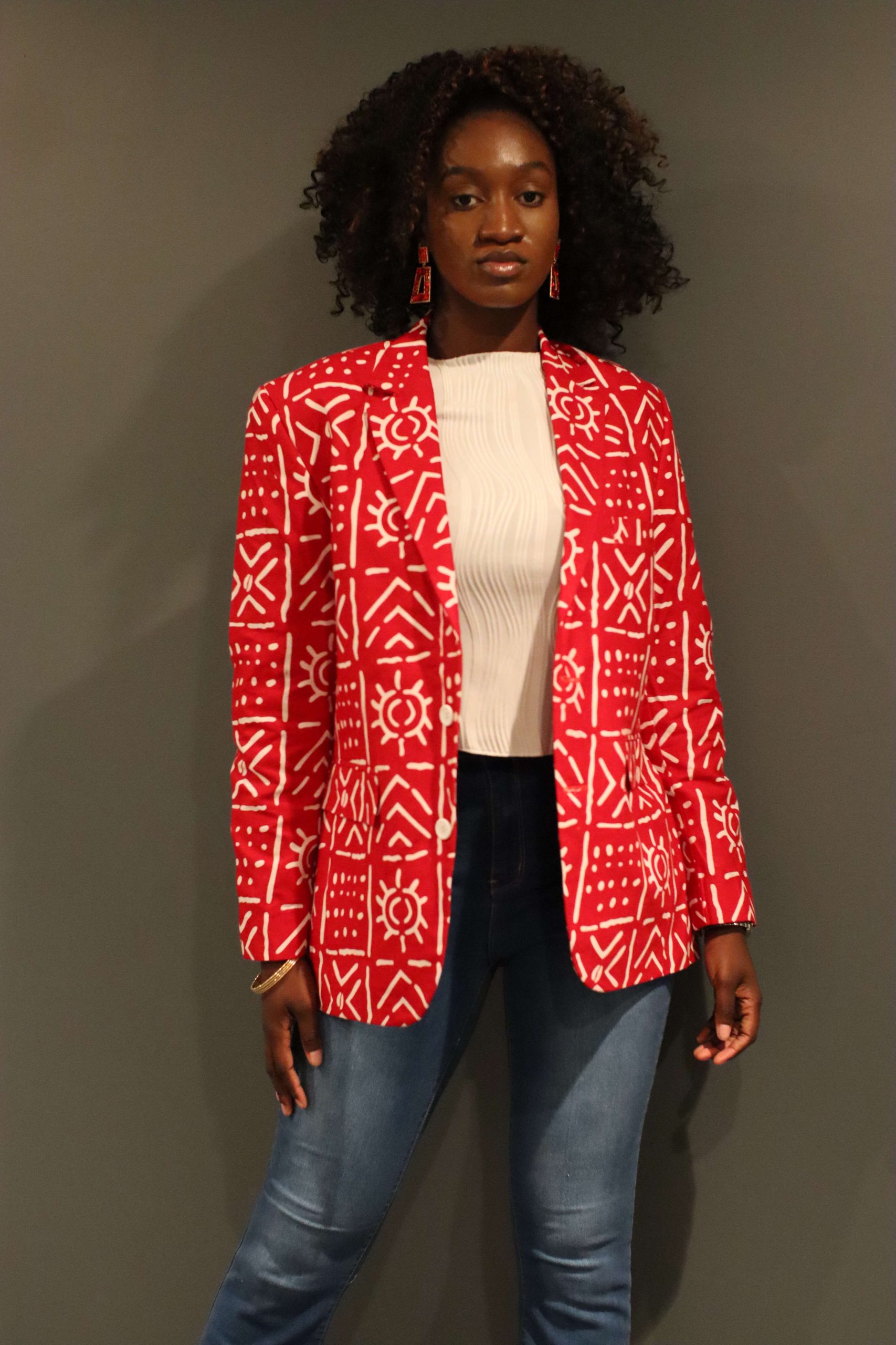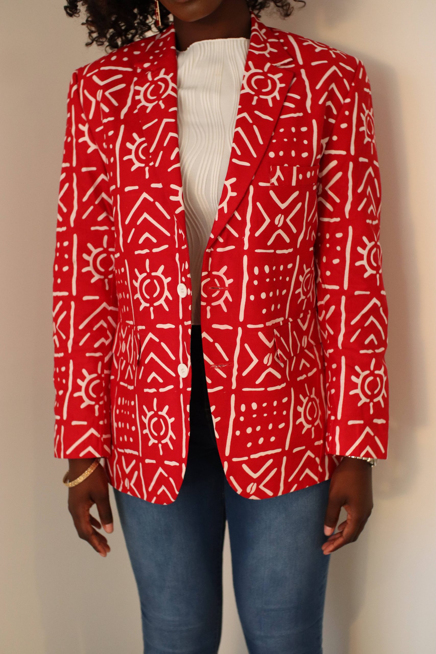 • Blazer en wax rouge, motifs ethniques blancs contrastants.
