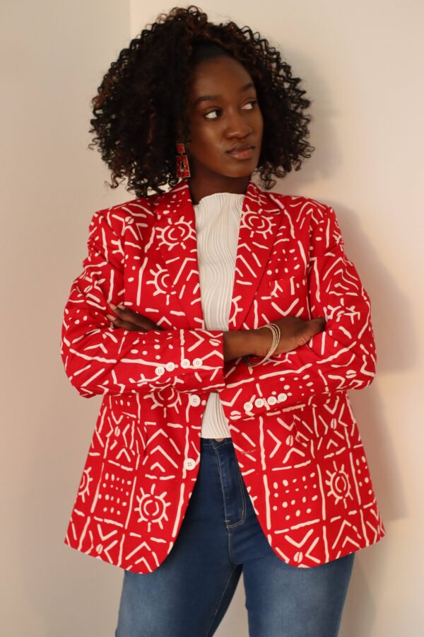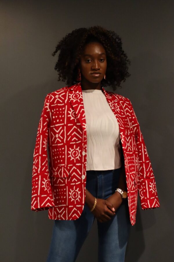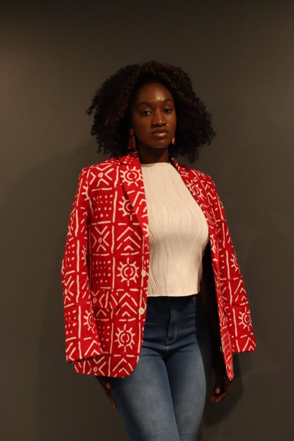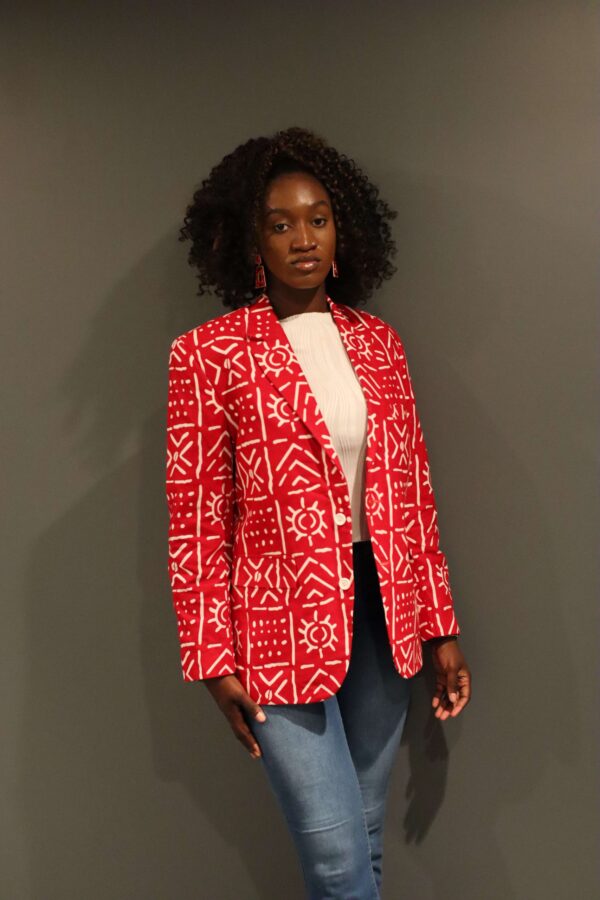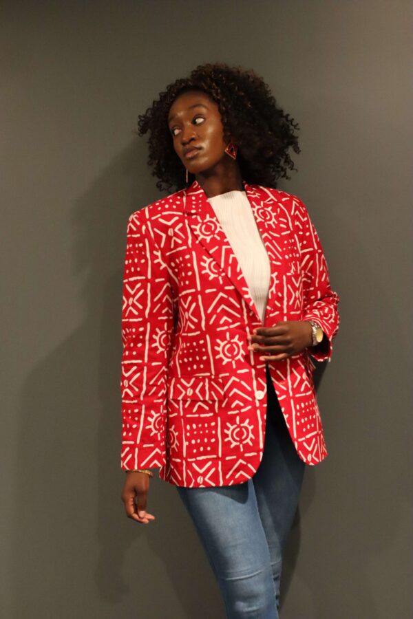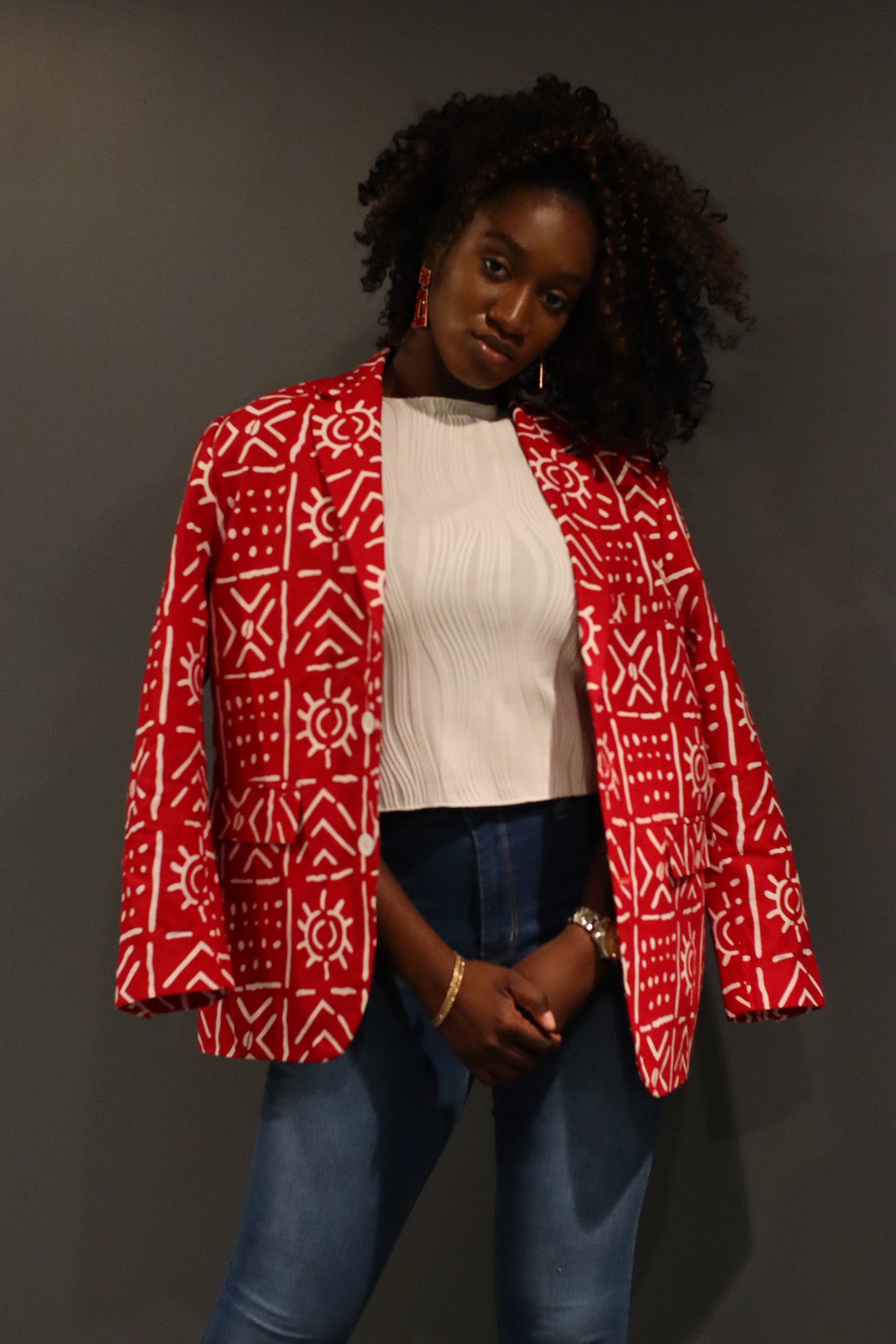 • Blazer en wax rouge, motifs ethniques blancs contrastants.