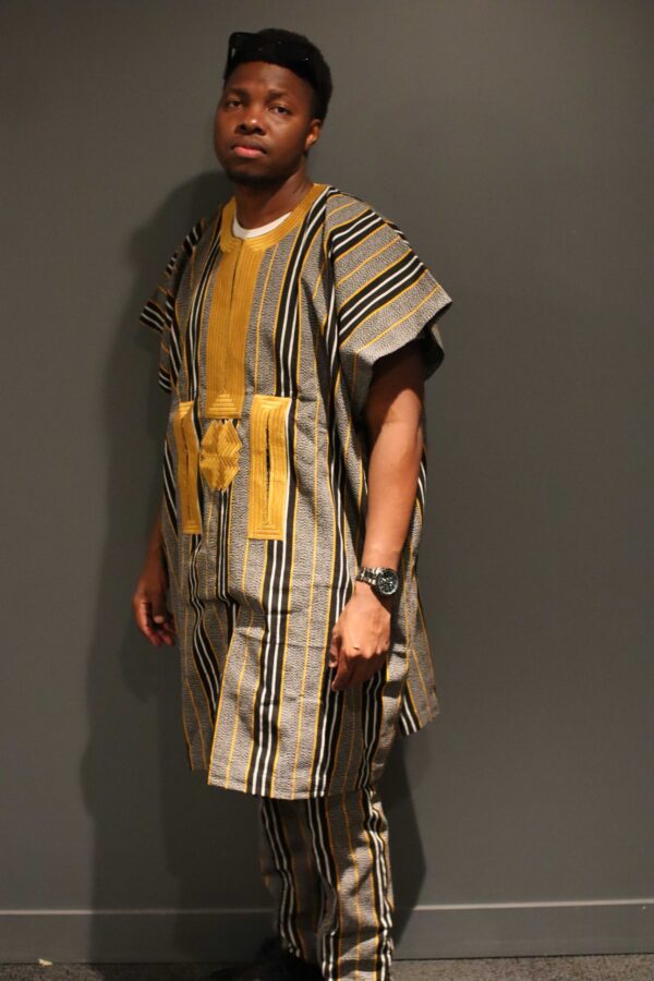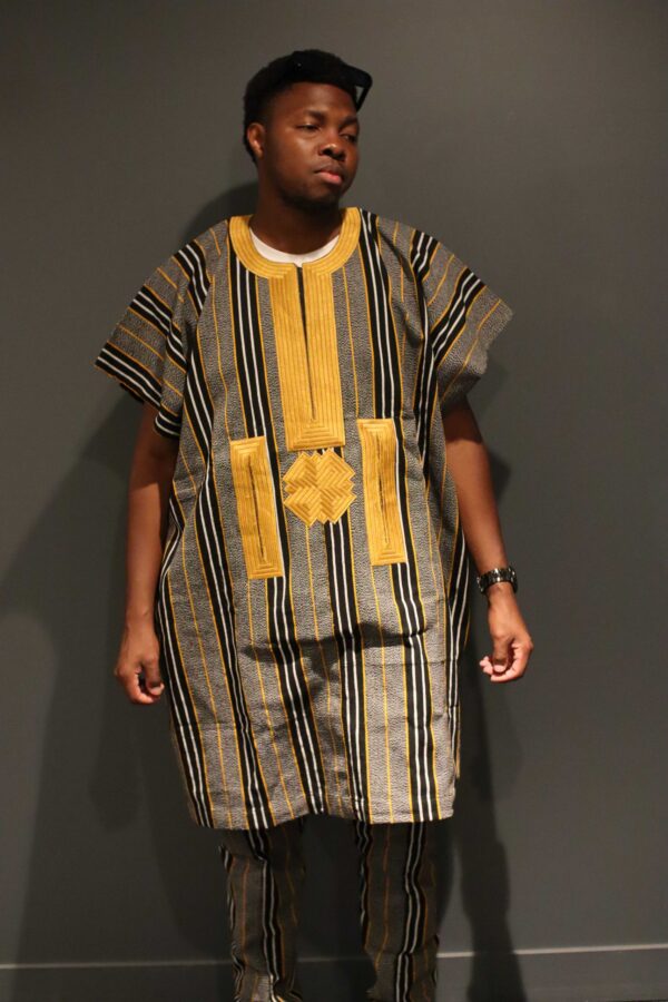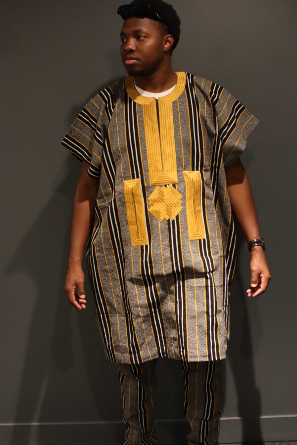 Sublimez votre allure avec cet ensemble majestueux, conçu pour l’homme qui allie tradition et élégance moderne. Fabriqué à partir d’un tissu noble aux rayures noires et dorées, cet ensemble incarne la puissance et la grâce des grands leaders africains.