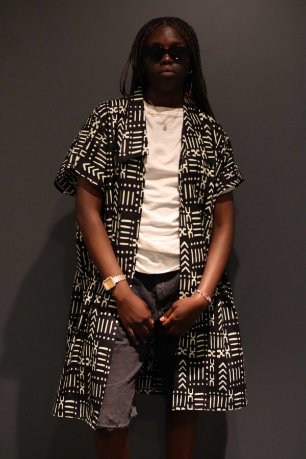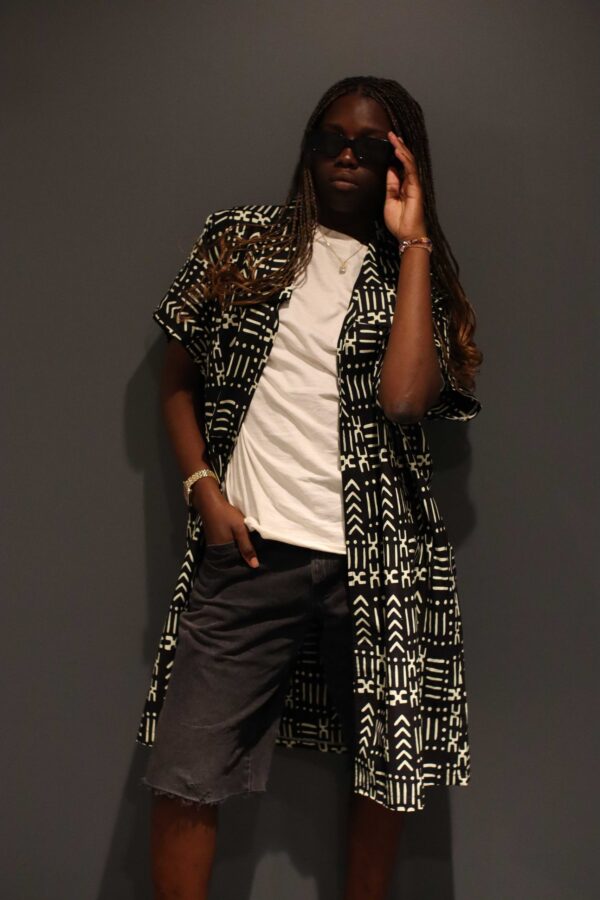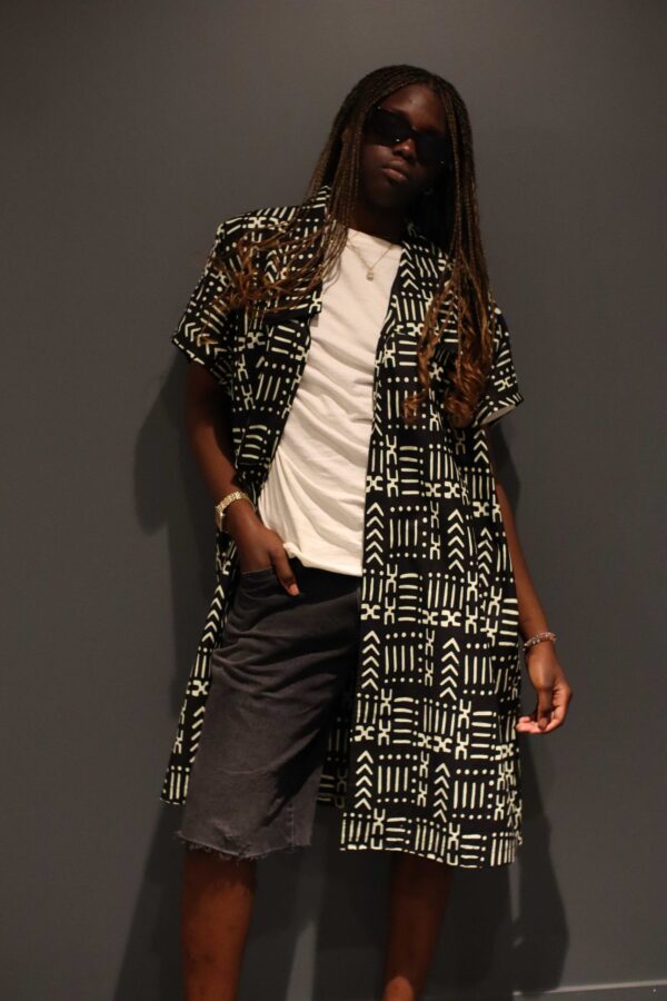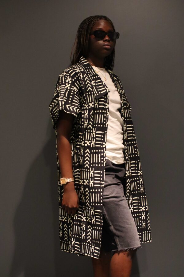 Adoptez un look urbain audacieux avec ce kimono streetwear en noir et blanc. Inspiré des motifs traditionnels africains, ce vêtement long et fluide offre une touche de sophistication moderne tout en restant décontracté. Confectionné dans un tissu léger, il est parfait pour superposer sur un t-shirt simple et un short, pour un look qui se distingue à la fois par son élégance et son attitude décontractée.