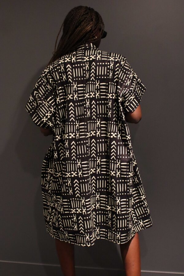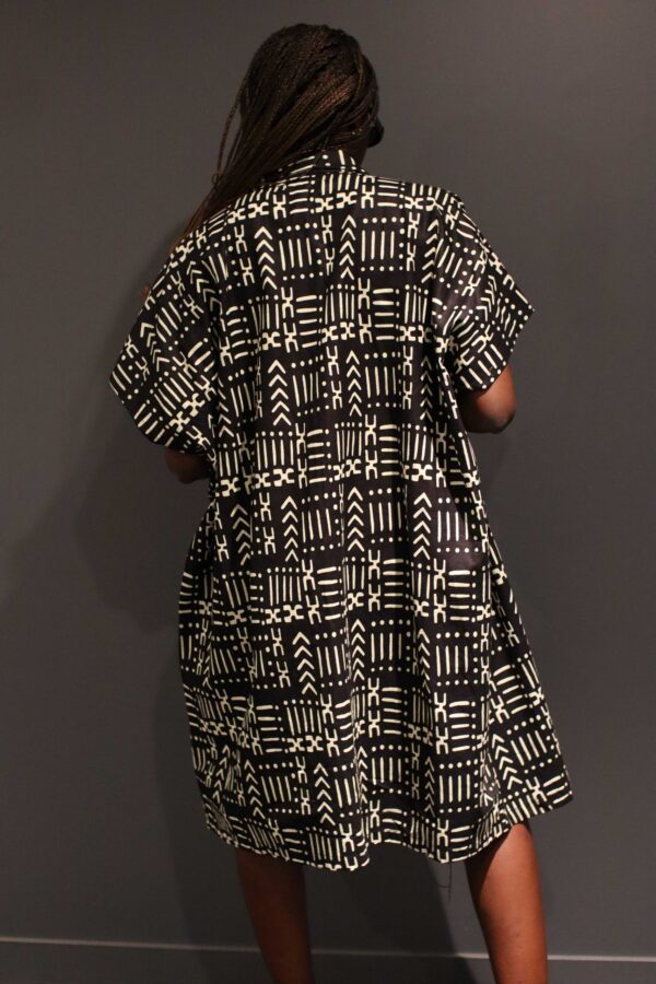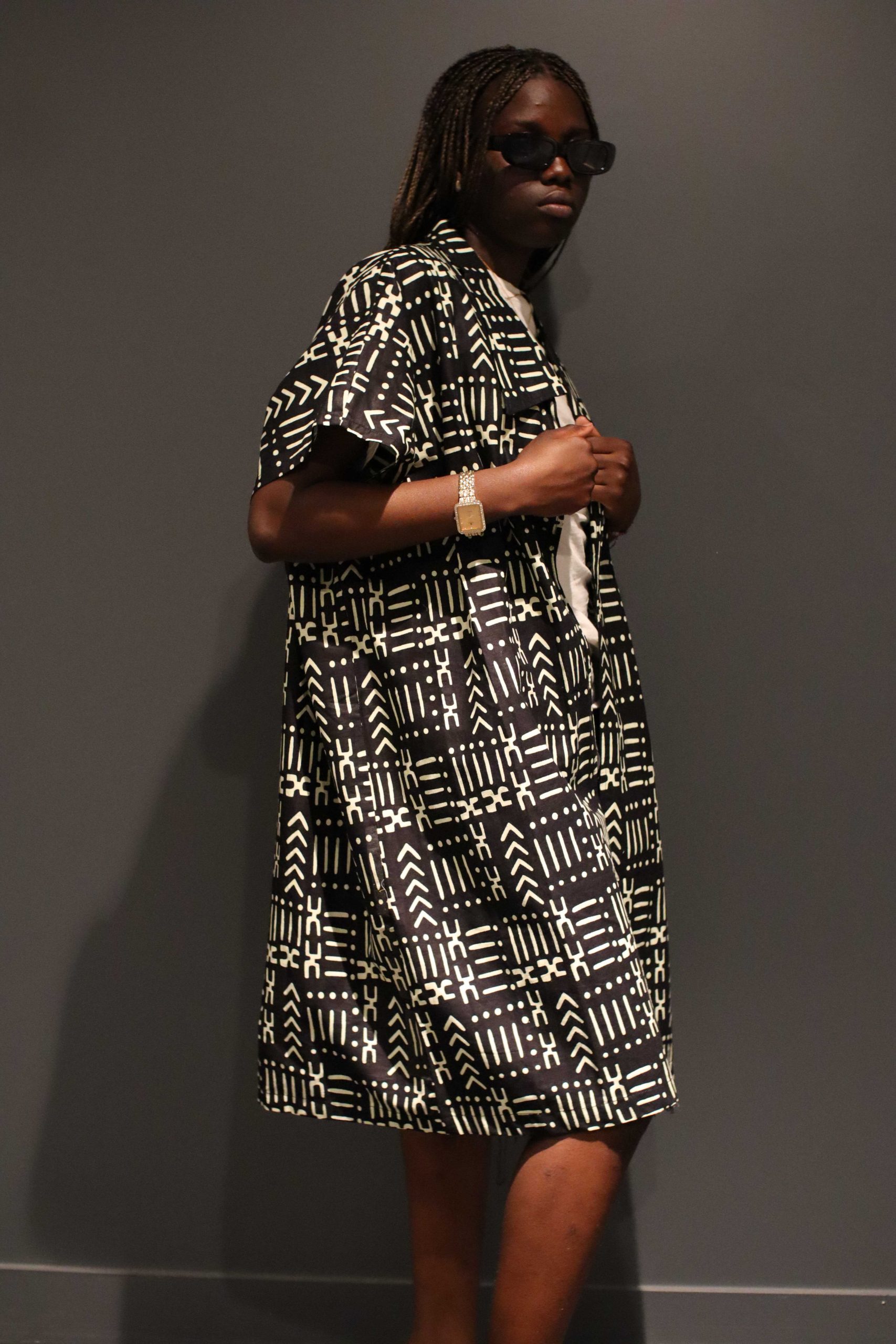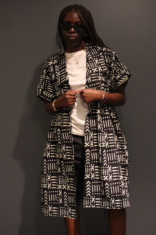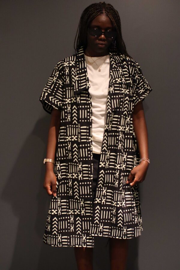 Plongez dans le style urbain avec ce kimono long au design graphique noir et blanc. Confectionné dans un tissu léger, il vous assure à la fois confort et élégance. Les motifs géométriques inspirés de l’art africain traditionnel apportent une touche d’authenticité tout en restant résolument moderne.